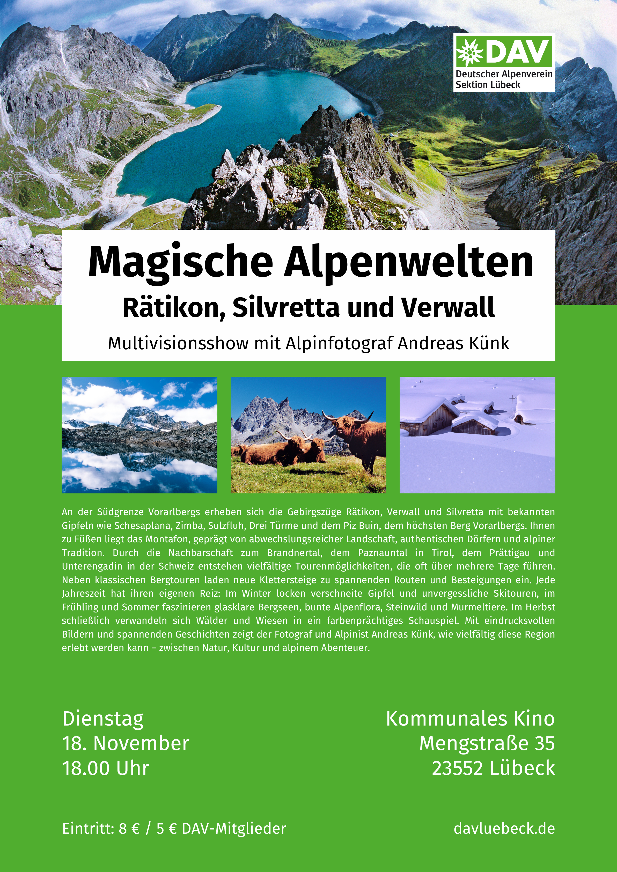 Der österreichische Alpinist und Fotograf Andreas Künk von Montafon Foto nimmt uns mit in den gebirgigen Süden Vorarlbergs. In seiner Multivisionsshow zeigt er die faszinierenden Landschaften von Rätikon, Silvretta und Verwall – eine eindrucksvolle Reise durch die Vielfalt der Alpen zwischen schroffen Gipfeln, glitzernden Bergseen und farbenprächtigen Jahreszeiten.